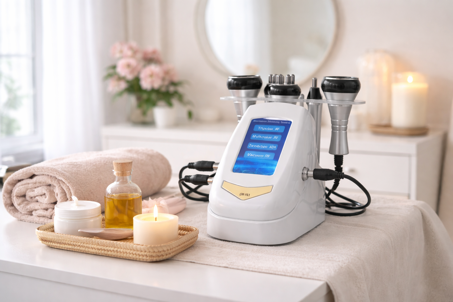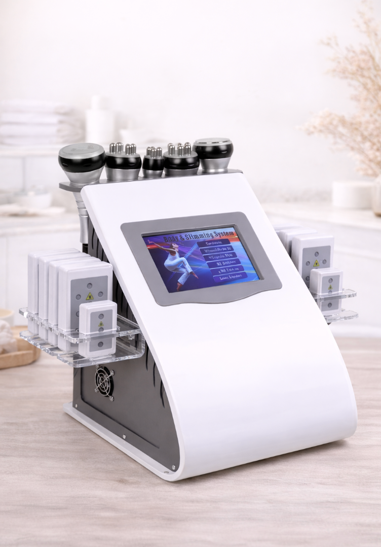 Notre machine combine lipocavitation 40K + radiofréquence multipolaire pour agir sur la graisse localisée et le relâchement cutané.